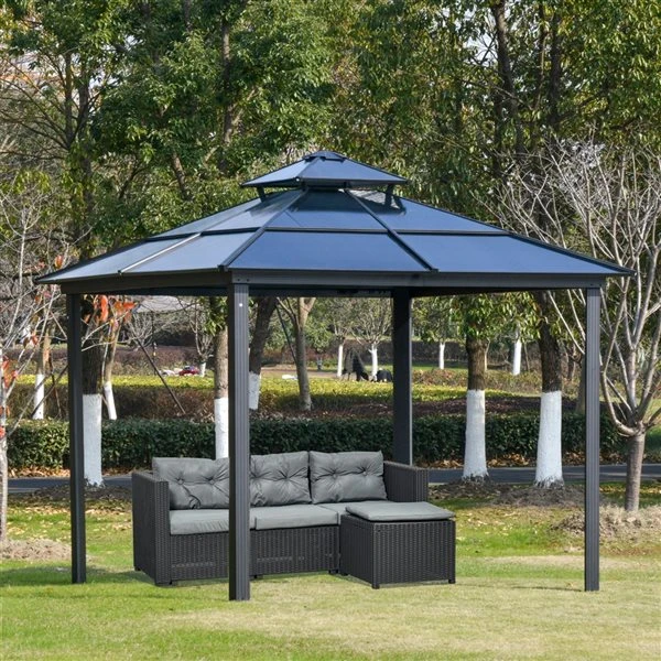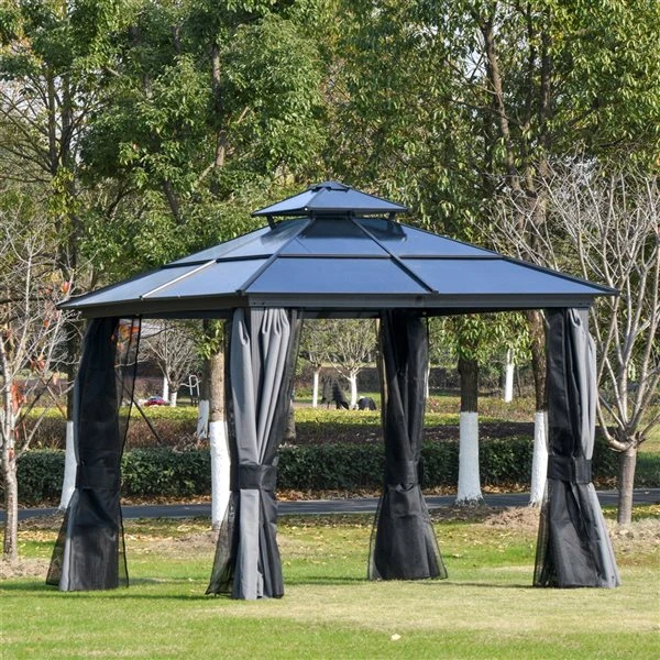 Cet abri de jardin Ă toit rigide est votre meilleur choix pour vous dĂ©tendre et profiter des cĂ©lĂ©brations. Ses grandes dimensions offrent un abri adaptĂ© pour vous et plusieurs autres personnes. Vous pouvez installer cet abri dans la cour ou au bord de la piscine, et organiser une rĂ©union agrĂ©able avec vos amis ou votre famille. Laissez cet abri de jardin pratique amĂ©liorer votre bien-ĂŞtre et votre qualitĂ© de vie.Abri de jardin pratique au design haut et spacieuxCadre en acier et aluminium pour une structure stableToit rigide en polycarbonate pour une protection contre les rayons UVToit Ă deux niveaux permettant une bonne circulation de l’airParois latĂ©rales et rideaux en maille respirante crĂ©ant un espace confortable