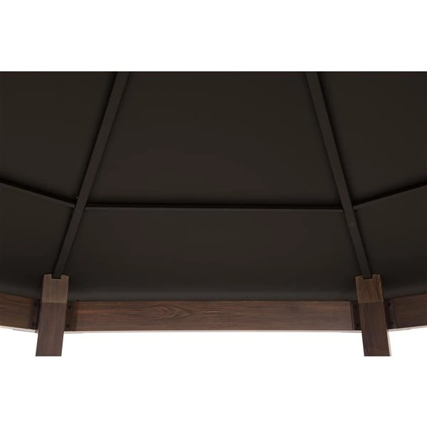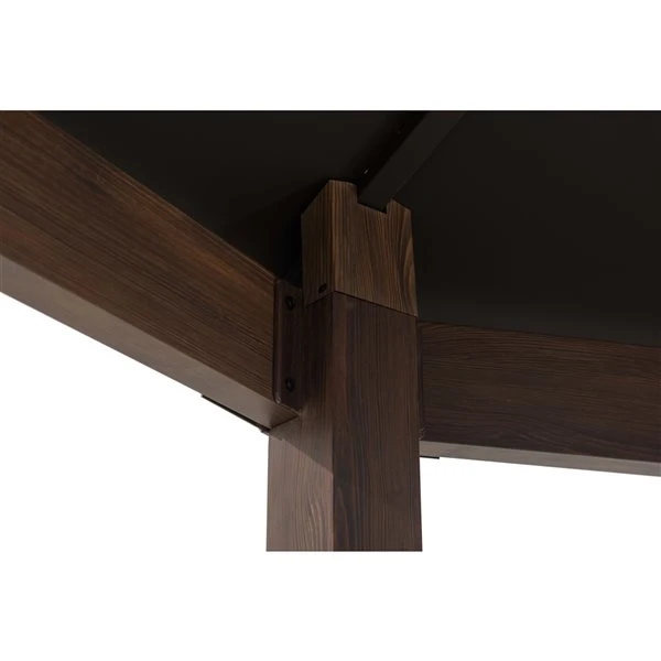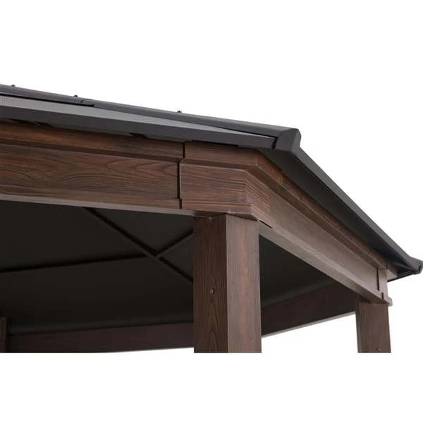 Améliorez votre espace de vie extérieur avec cet abri de jardin de Sunjoy. Il offre un espace ombragé pour se détendre au bord de la piscine pendant les chaudes journées d’été ainsi qu’un havre de paix pour les amis et la famille. Le fini intemporel thermolaqué brun résistant aux intempéries sur le toit en aluminium antirouille résistera à l’épreuve du temps. La conception du toit procure de l’ombre tout en tenant à distance les intempéries occasionnelles. Créez une ambiance en suspendant un lustre au crochet intégré au plafond pour un éclairage fonctionnel et un style élégant. Grâce aux instructions de montage simples et faciles à suivre, vous pourrez vous détendre avec la boisson de votre choix dans votre nouvel espace de vie extérieur préféré pendant des années.Revêtement thermolaqué brun résistant aux intempéries sur un toit en aluminium antirouilleStructure robuste en aluminium et en acier galvanisé résistant à la rouilleStructure aspect bois naturel avec crochet pour suspendre de l’éclairagePoids du produit de 372 lbPoteau extérieur au poteau opposé 14,1 pieds et dégagement du sol à la structure 6,8 piedsDimensions du poteau : 4,4 po x 4,4 poRésistance au vent : 31,1 mi/h