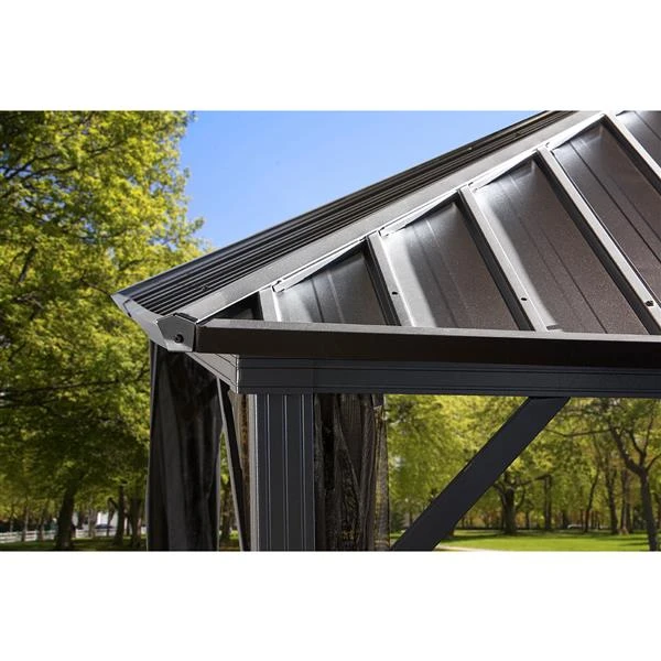 Que dire à propos du Dakota mis à part que c’est le gazebo idéal. Avec sa structure en aluminium et son toit en acier galvanisé, il saura vous prouver sa durabilité. Retrouvez l’avantage d’un toit en tissu offrant de l’ombre à 100 % sans le désavantage d’avoir à le changer. Le toit d’acier galvanisé ne changera pas de couleur, est imperméable et durable. Un achat sans souci!Le Dakota est fait d’une structure d’aluminium de haute qualitéLe toit est fait d’acier galvanisé de haute qualité qui bloque complètement le soleil et donc procure une ombre complèteIl est muni d’un système de rail double pour acceuillir la moustiquaire de nylon et les rideaux d’intimités (rideaux vendus séparément)Nul besoin de ranger le toit pour l’hiver. La neige devrait cependant toujours être enlevéeHuit barres de renfort sont ajoutées à chaque coin de l’abri pour une meilleure stabilité et solidité de la structure