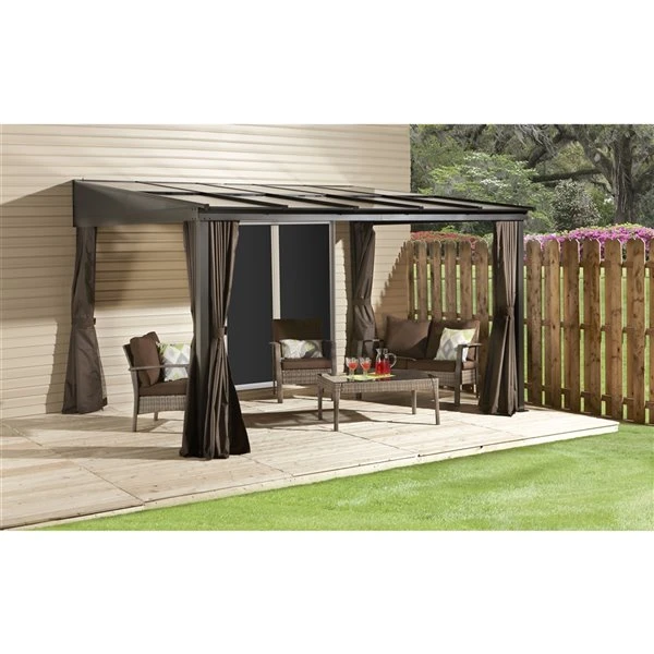 Cet abri de jardin unique est conçu pour être une extension de votre maison. La structure en aluminium durable et le toit fait de panneaux de polycarbonate peuvent être laissés à l’extérieur, peu importe la saison. Le Pompano vous offre une protection du soleil, tout en laissant la lumière passer à travers des panneaux de toit. Avec sa moustiquaire en nylon et ses rideaux d’intimité inclus, vous pourrez profiter de votre cours sans la présence d’insectes et être à l’abri des regards!Le Pompano est fait d’une structure d’aluminium de haute qualité.Le toit est fait de feuilles de polycarbonate teintées, protégées contre les rayons UV, d’une épaisseur de 8 mm ce qui permet à une partie de la lumière de pénétrer à l’intérieur.Muni d’un double système de rail pour acceuillir la moustiquaire de nylon et des rideaux d’intimité inclus à l’achatNul besoin de ranger le toit pour l’hiver. Cependant, la neige devra toujours être enlevée.