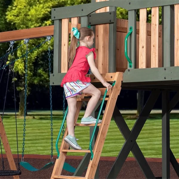 Cachette, poste d’observation, ou camping? Encore mieux qu’une cabane dans un arbre, l’Eagle’s Nest Elite est l’aire de jeu idéale pour toutes les activités que vos enfants peuvent imaginer. C’est la combinaison parfaite d’une maison de jeu et d’une aire de jeu. Tous les petits campeurs ou grimpeurs passeront avec joie des heures interminables à courir, à comploter et à grimper sur le mur d’escalade ou dans le nid de pie. Les parents peuvent se reposer en laissant leurs enfants se balancer sur les balançoires de 26 po pour plus de sécurité et de durabilité. La balançoire en forme de disque incluse offre la combinaison parfaite d’exercice et de plaisir avec la corde en nylon durable pour garder les petites mains et les petits pieds en sécurité.Assemblage facile pris en charge par l’application interactive BILT étape par étapeAssez spacieux pour le campingRecherchez des trésors anciens dans tous les recoins des plates-formes de 5 pi, 6 pi et 7 pi ( 1,5 m, 1,8 m et 2,1 m)Obtenez une vue d’ensemble de votre terrain depuis le nid de pie de 7 pi (2,5 m) de hautDescendez le toboggan à vagues de 10 pi (3 m) à double paroiEscaladez le mur de roche jusqu’au porche et surveillez l’ennemiGarantie limitée de 5 ansDeux balançoires robustes et une balançoire en forme de disque surdimensionnéChaînes de balançoire robustes