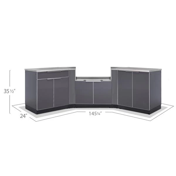 Ajoutez un espace de rangement moderne et fonctionnel à votre espace de vie extérieur avec les armoires de cuisine extérieure gris ardoise. Constituées d’aluminium de qualité aéronautique, ces armoires robustes et durables offrent un espace de rangement volumineux et résistant aux intempéries pour vous aider à vous organiser. Les portes en verre trempé gris ardoise avec poignées intégrées donnent un style moderne et élégant qui s’harmonise avec n’importe quelle maison. Les dispositifs de nivellement réglables en hauteur maintiennent vos armoires à niveau sur les terrasses inégales et les pierres de patio.Les étagères réglables et les tiroirs extra profonds offrent un espace de rangement polyvalent pour ranger des articles de toutes les tailles. La quincaillerie à fermeture ralentie permet de fermer les portes et les tiroirs en douceur. Restez organisé et modernisez votre espace de vie dans votre cour arrière grâce aux armoires de cuisine extérieure gris ardoise de NewAge Products.Votre ensemble comprend : 1 Armoire pour bar, 1 Paire d’armoires d’angle à 45 degrés, 1 Armoire avec gril encastré de 33 po, 1 Armoire à deux portes, 2 Plans de travail de 32 po, et Housses quatre saisonsBâti à partir de cadres en aluminium de qualité aéronautiquePortes en verre trempé de 4 mm résistantes aux chocsQuincaillerie à fermeture ralentie permettant aux portes et tiroirs de se refermer en douceurDispositifs de nivellement ajustables en hauteur pour les surfaces inégalesLe plan de travail en acier inoxydable peut être mis en contact avec des aliments sans risque, résiste à la corrosion et se nettoie d’un simple coup de chiffonLes housses en polyester quatre saisons de haute qualité protègent votre cuisine extérieureL’armoire avec gril encastré de 33 po est compatible avec la plupart des grils de 28 à 33 poL’armoire pour bar comporte un casier à bouteilles réglable en hauteur, un tiroir complètement extensible permettant de conserver les boissons au frais et des poubelles