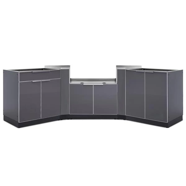 Ajoutez un espace de rangement moderne et fonctionnel à votre espace de vie extérieur avec les armoires de cuisine extérieure gris ardoise. Constituées d’aluminium de qualité aéronautique, ces armoires robustes et durables offrent un espace de rangement volumineux et résistant aux intempéries pour vous aider à vous organiser. Les portes en verre trempé gris ardoise avec poignées intégrées donnent un style moderne et élégant qui s’harmonise avec n’importe quelle maison. Les dispositifs de nivellement réglables en hauteur maintiennent vos armoires à niveau sur les terrasses inégales et les pierres de patio.Les étagères réglables et les tiroirs extra profonds offrent un espace de rangement polyvalent pour ranger des articles de toutes les tailles. La quincaillerie à fermeture ralentie permet de fermer les portes et les tiroirs en douceur. Restez organisé et modernisez votre espace de vie dans votre cour arrière grâce aux armoires de cuisine extérieure gris ardoise de NewAge Products.Votre ensemble comprend : 1 Armoire pour bar, 1 Paire d’armoires d’angle à 45 degrés, 1 Armoire avec gril encastré de 33 po, et 1 Armoire à deux portesBâti à partir de cadres en aluminium de qualité aéronautiquePortes en verre trempé de 4 mm résistantes aux chocsQuincaillerie à fermeture ralentie permettant aux portes et tiroirs de se refermer en douceurDispositifs de nivellement ajustables en hauteur pour les surfaces inégalesInstallez le plan de travail personnalisé de votre choix et marquez votre différenceArmoires résistantes aux intempéries pouvant être utilisées en toute saisonL’armoire avec gril encastré de 33 po est compatible avec la plupart des grils de 28 à 33 poL’armoire pour bar comporte un casier à bouteilles réglable en hauteur, un tiroir complètement extensible permettant de conserver les boissons au frais et des poubelles