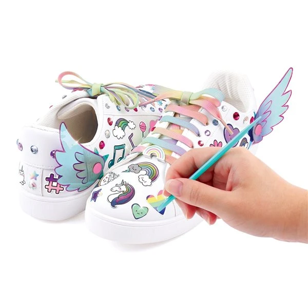 Crée des autocollants étonnants avec un éclat pour faire briller tes chaussures. Choisis l’autocollant, l’endroit, la colle et la décoration. Les lacets brillants et les ailes de chaussures viennent donner le style chic ultime.Chic autocollants: Ce sont des tatouages éphémères pour vos chaussures.Ajoute du style à tes chaussures avec des autocollants adhésifs décoratifs. Ajoutes-en un peu ou beaucoup. Transforme tes chaussures encore et encore.Comprends des breloques en perles et des lacets de chaussures (l’adhésif se décolle – enlève tout excès avec de l’eau tiède). Non recommandé pour certaines fabrications de chaussures.