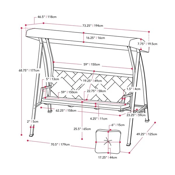 Profitez de l’air frais sur la toute dernière balançoire de patio de CorLiving. Offrant une protection à la fois contre le soleil et la pluie légère, vous pourrez profiter de ce confort tout au long de l’année. L’osier en résine durable soutient les coussins confortables et d’appoint assorti pour un confort durable pendant que vous vous balancez. L’auvent à inclinaison variable offre une couverture solaire parfaite sous tous les angles tout au long de la journée. Profitez d’un livre, d’un cocktail ou d’une sieste pour parfaire le plaisir de votre jardin.Les coussins et oreillers décoratifs sont super confortables et disposent de housses amovibles pour un nettoyage facileLe cadre en acier massif est thermolaqué, offrant solidité et résistance aux intempériesLe grand auvent inclinable en tissu est imperméable et légèrement incliné pour éviter la formation de flaques en cas de pluieLe siège est fabriqué à partir de rotin en résine durable pour garantir un plaisir durable.Assemblage facile