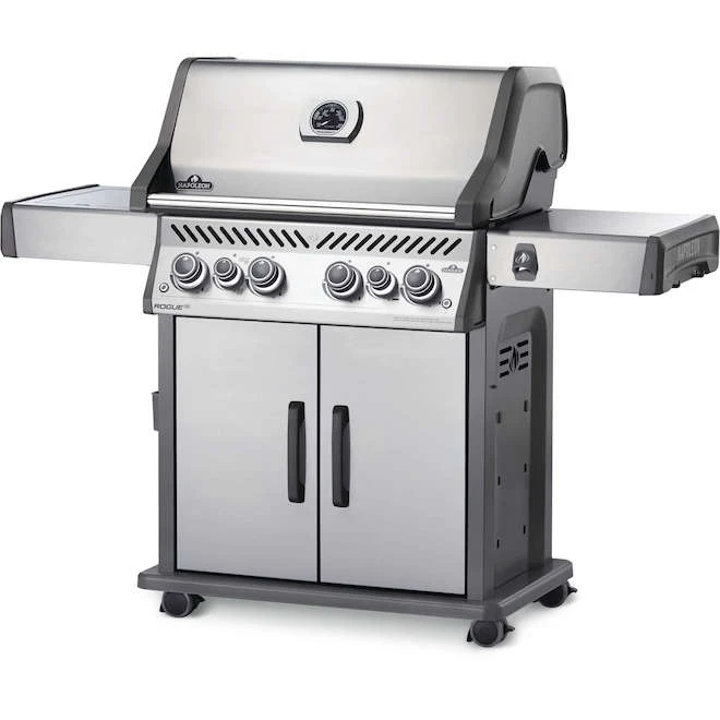 Ce barbecue à 4 brûleurs est doté d’un brûleur de rôtisserie infrarouge arrière, parfait pour faire rôtir lentement à la broche de nombreux plats délicieux (kit de rôtisserie vendu séparément). Ses grilles de cuisson en acier inoxydable ne nécessitent pratiquement aucun entretien. Le contrôle précis de la chaleur permet de griller et de rôtir à basse température ou d’augmenter la chaleur pour saisir les aliments. Allumez ce gril instantanément grâce à son allumage sans pile. Ce système d’allumage à sécurité intégrée allume immédiatement les brûleurs avec un jet de flamme. Les grilles de cuisson uniques en forme de vague assurent une cuisson uniforme, empêchent les aliments de passer au travers et produisent des marques de saisie exceptionnelles. Les étagères latérales rabattables permettent de ranger ce barbecue à l’abri des regards et réduisent l’encombrement, ce qui le rend idéal pour les balcons et les petits patios. Comprend un ouvre-bouteille intégré, un couvercle haut et un nouveau panneau de commande élégant avec boutons ergonomiques rétroéclairés. Garantie de 15 ans. Barbecue au gaz propane équipé de 4 brûleurs d’un total de 76 500 BTU et d’une surface de grillage de 850 pouces carrésBarbecue en acier inoxydable résistant à la rouille qui conservera son élégance malgré une exposition aux intempériesAssemblage requis : Sélectionnez l’option d’assemblage professionnel pour recevoir un gril assemblé. Si aucune option d’assemblage professionnel n’est disponible, l’article arrivera non assembléLe brûleur de rôtisserie infrarouge arrière est parfait pour rôtir lentement à la broche de nombreux plats délicieux (kit de rôtisserie non inclus)La station de saisie intégrée permet de saisir parfaitement les steaks à la manière d’un steak house. La chaleur infrarouge produit des températures incroyablement élevées et constitue également l’endroit idéal pour préparer les sauces et les accompagnementsLes grilles de cuisson en acier inoxydable ne nécessitent pratiquement aucun entretienLe contrôle précis de la chaleur permet de griller et de rôtir à basse température ou d’augmenter la chaleur pour saisir les alimentsAllumez instantanément le gril du barbecue rogue grâce à l’allumage sans pile. Ce système d’allumage à sécurité intégrée allume immédiatement les brûleurs avec un jet de flammeLes plaques de saisie à double niveau en acier inoxydable récupèrent et vaporisent les gouttes de nourriture, protégeant ainsi les brûleurs tubulaires en acier inoxydable contre les dommages et gardant votre barbecue plus propre