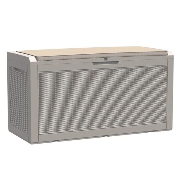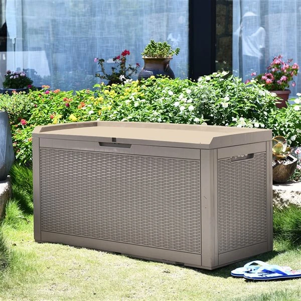 Cette boîte de rangement en rotin en résine PP est une solution élégante parfaite pour ranger vos outils, jouets et ustensiles de jardin. Fabriqué avec élégance et style, le matériau PP durable qui reproduit l’apparence et la sensation de l’osier traditionnel vous assure durabilité et stabilité. Livré avec un coussin de siège suffisamment solide pour que 2 personnes s’assoient sur la boîte de rangement. Conviens à la fois pour l’intérieur et l’extérieur, il peut parfaitement être compatible avec divers ensembles de meubles de patio. Lorsqu’il n’est pas utilisé, intégrez deux poignées latérales permettant un transport facile.Moulage et matériau PP durable qui reproduisent l’apparence et la sensation de l’osier traditionnelOffre un espace de rangement adéquat, ce qui garantit un espace précieux pour les outils, les jouets et d’autres ustensiles de jardinDeux poignées latérales permet un transport facileCapacité maximal: 66 lb