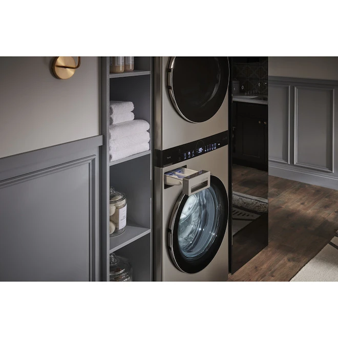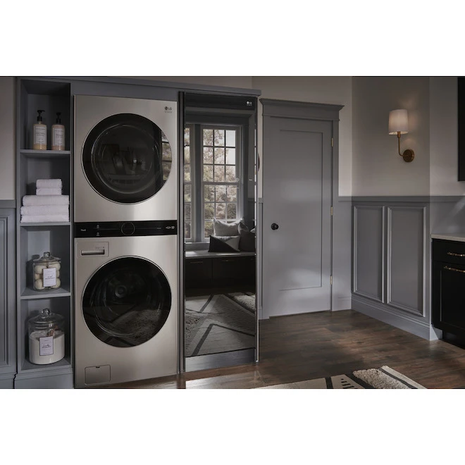 Ce centre de buanderie simple et élégant qui prend la moitié de l’espace ne manquera pas de se faire remarquer. Vous envisagez de placer la buanderie dans votre suite principale ou dans un placard ? Aucun problème. Tout cela pour que vous puissiez prendre le meilleur soin des vêtements préférés de votre famille. La WashTower(MC) de LG Studio est de taille standard et entièrement équipée, avec la laveuse en bas et la sécheuse en haut. L’intelligence intégrée élimine les devinettes grâce aux dernières innovations en matière de nettoyage. Contrairement aux paires superposées classiques, le panneau de contrôle exclusif(MC) dispose des deux panneaux de commandes à la bonne hauteur. Lavage et séchage avancés – TurboWash 360° Cycle de lavage Allergiene TurboSteamLave-linge monobloc avec panneau de commande central pour faciliter le chargement et le déchargement du sèche-lingeLaveuse et sécheuse à très grande capacité de 5,8 pi3 et 7,4 pi3Intelligence intégrée – Capteurs de tissu IA/apprentissage intelligent/appariement intelligentPortes en verre trempé et tambour en acier inoxydable NeveRustTechnologie ThinQ®/Assistance clientèle proactive