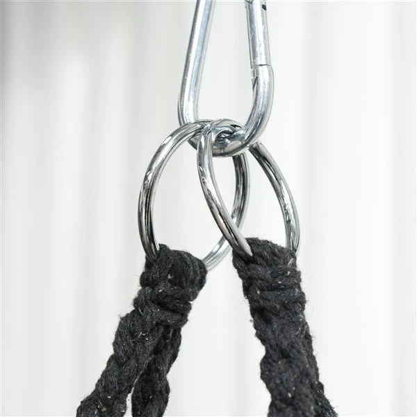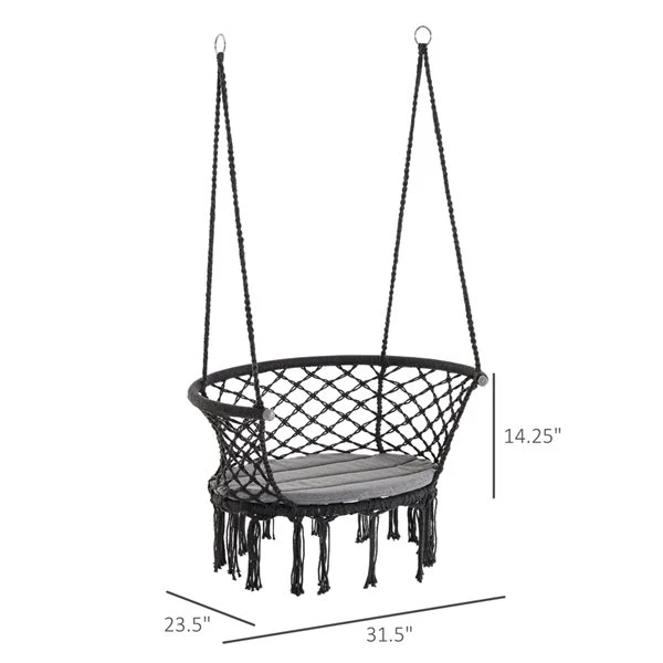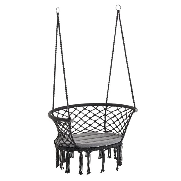 Ajoutez de l’élégance à vos espaces intérieurs ou extérieurs en toute simplicité avec cette chaise-hamac à corde suspendue d’Outsunny. Cette chaise de style bohème est conçue avec un siège spacieux, où la corde de coton en filet forme le siège et le dossier avec des glands à franges pour un style attrayant et unique. Fabriqué en métal pour plus de solidité et de fiabilité, le siège avant est légèrement incurvé pour une assise confortable, et l’accoudoir offre un soutien en cas de besoin.La chaise-hamac suspendue présente un motif de filet macramé avec des glands à frangesIdéale pour une utilisation à l’intérieur et à l’extérieurFabriquée en métal solide pour une résistance et une durabilité prolongéesLe dossier, le coussin de siège et les accoudoirs légèrement incurvés assurent le confortLe poids léger permet un transport facile