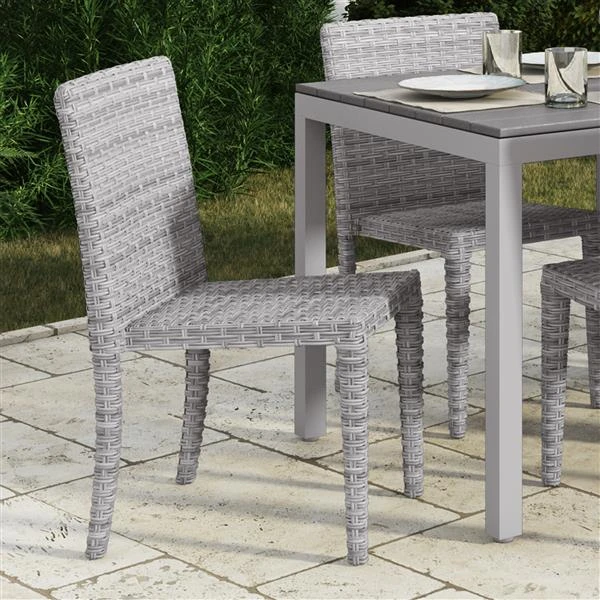 Cet ensemble de 4 chaises pour patio est l’ajout idéal à votre espace repas extérieur. Dotées d’une structure robuste en aluminium thermolaqué, elles sont méticuleusement enveloppées dans un magnifique osier de résine à tissage large résistant aux rayons UV. Nécessitant peu d’entretien, elles sont également empilables ce qui en facilite le rangement à la fin de chaque saison. Ces chaises s’agenceront à merveille à votre cour arrière et dureront des années.Structure robuste et durable en aluminium thermolaqué résistant à la rouilleEnveloppées dans un magnifique osier de résine de couleur gris mixte résistant aux rayons UVChaises empilables pour un rangement plus facileVendues en ensemble de 4Peu d’entretien nécessaireAucun assemblage requis