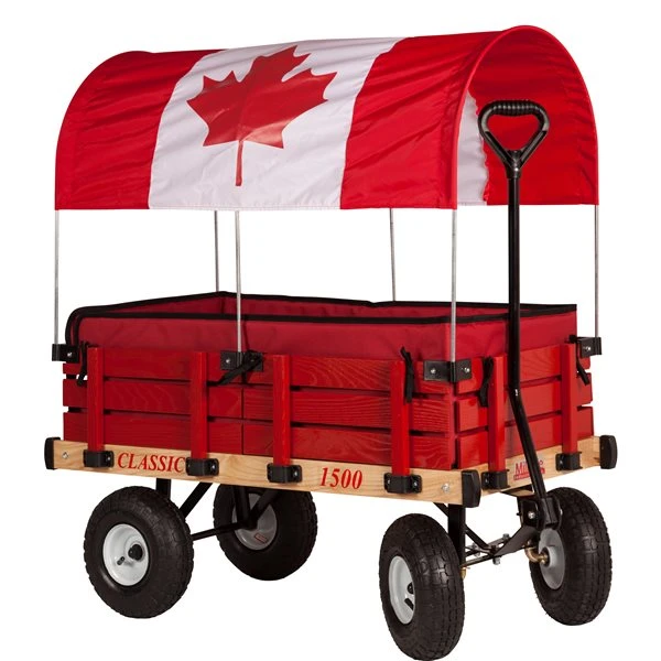 Ce chariot classique pour enfants est doté d’un auvent à l’effigie du drapeau canadien. Ce chariot unique est parfait pour être utilisé en tout temps, peu importe la météo ! Parfait pour transporter vos enfants pendant votre randonnée préférée. L’auvent est hydrofuge et protège du soleil. La poignée se replie pour un rangement facile. Taille de la plate-forme : 20 pouces x 38 pouces; taille des pneus : 4 pouces x 10 pouces.Ridelles rouges amoviblesInclus des coussins de plancher et de contour confortablesFabriqué à la main au Canada