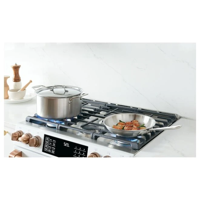 Découvrez votre passion pour les réceptions. Cette cuisinière encastrable biénergie allie la puissance d’une table de cuisson au gaz à la précision d’un four électrique. La première table de cuisson bord à bord de l’industrie comportant six brûleurs polyvalents possède également une plaque de cuisson intégrée qui permet de préparer facilement des repas copieux et les plats préférés de la famille. Les deux fours vous permettent de préparer différents aliments à des températures distinctes en même temps. Wi-Fi intégré, alimenté par l’application SmartHQ : gérez tous les aspects de votre cuisine à l’aide de l’application SmartHQ ou de votre assistant vocal (certaines fonctions requièrent une connexion Wi-Fi)Tout ce dont vous avez besoin pour obtenir des résultats inoubliables : obtenez la précision nécessaire pour organiser un dîner à plusieurs plats grâce à cette cuisinière à deux fours biénergie de 6,7 pi³, dotée d’une table de cuisson à gaz qui assure un maintien précis de la chaleur et d’un four électrique à convection vraie dotée d’un système de ventilation précis qui garantit des résultats de cuisson uniformesPartagez vos créations préférées avec vos proches : créez un dîner inoubliable à l’aide d’un brûleur à trois anneaux de 21 000 BTULes grilles robustes simplifient la mise en place et le retrait : accédez facilement à tout, des rôtis lourds aux desserts délicats, grâce aux grilles sur galets robustes qui glissent en douceur sur des roulements à billes et qui résistent à la chaleur de la fonction d’autonettoyageLa vaste table de cuisson à six brûleurs vous permet de recevoir facilement : il est facile de recevoir de grands groupes grâce à la première table de cuisson à six brûleurs, bord à bord, de l’industrie, qui peut accueillir des casseroles de toutes taillesFriteuse à air sans préchauffage : cuisinez des versions plus saines et plus croustillantes de vos aliments préférés en moins de temps, grâce à une friteuse à air directement dans votre four, qui ne demande aucun préchauffage, ni panier, ni plateau spécial (technologie Wi-Fi)Choisissez une combinaison de finitions haut de gamme et d’options de quincaillerie afin de lui donner une allure qui soit le reflet de votre style personnelUn aspect attrayant à tout moment : chaque détail de votre cuisine est conçu pour plaire, grâce à un panneau de commande DEL élégant qui disparaît visuellement lorsqu’il n’est pas utilisé et qui se réveille lorsqu’il est sollicitéPréparez les aliments à la cuisson parfaite : obtenez des rôtis et des viandes à point grâce à une sonde de température qui vous permet de surveiller la progression sans ouvrir la porte du four
