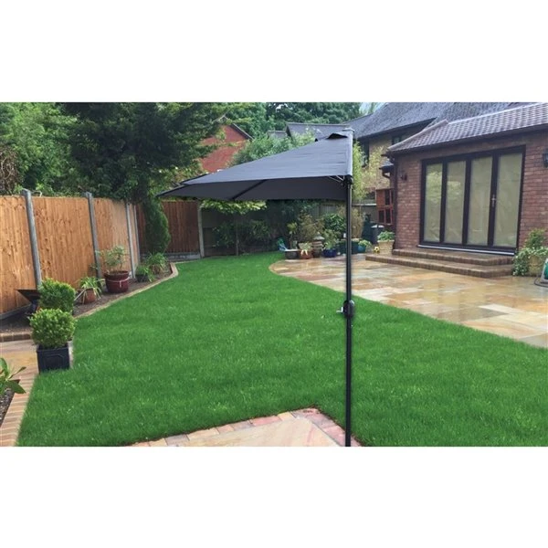 Ce demi-parasol est parfait pour les petits espaces ou les terrasses. Il possède un poteau et une armature en aluminium noir, une manivelle et une toile grise. Il est recommandé de l’utiliser avec une demi-base de parasol.Fermer lorsqu’il venteRanger pour l’hiverSans inclinaison