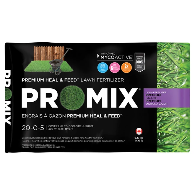 Obtenez une pelouse verdoyante avec un minimum d’entretien en utilisant l’engrais à pelouse « Heal and Feed » de marque Pro-Mix. Cet engrais 20-0-05 de première qualité à libération lente nourrit continuellement votre pelouse pendant une période de six semaines en une seule étape rapide et facile. Il contient un stimulateur de croissance appelé Mycoactive(MD) qui améliore la résistance de la pelouse face au stress et permet d’obtenir une pelouse en santé et luxuriante. Azote à libération lenteEngrais pour gazon de qualité supérieure avec technologie exclusive d’ingrédients mycoactifsLe mélange d’engrais contient de la mousse de tourbe associée à des stimulateurs de croissance organiques qui réintègrent les nutriments dans le solPastille tout en un pour une distribution uniforme
