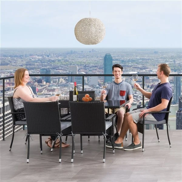 Cet ensemble de 7 pièces est parfait pour toutes les occasions. Robuste et durable, son cadre en acier peint résiste à la rouille et son osier en résine anti-UV, résistant à tous les temps, conserve un aspect brillant et frais année après année. Le plateau en verre trempé est aussi élégant que fonctionnel. Il comprend 6 chaises empilables faciles à ranger, avec des coussins confortables en peluche qui peuvent être facilement enlevés. L’ensemble comprend 6 chaises et 1 table.Fabriqué en acier galvanisé avec un revêtement poudré pour une meilleure durabilitéFabriqué en résine d’aspect osier résistant aux fissures et à la décolorationPlateau en verre trempéPieds en métal pour un soutien optimalEmpilable pour un rangement facileCoussins amovibles pour un rangement facile