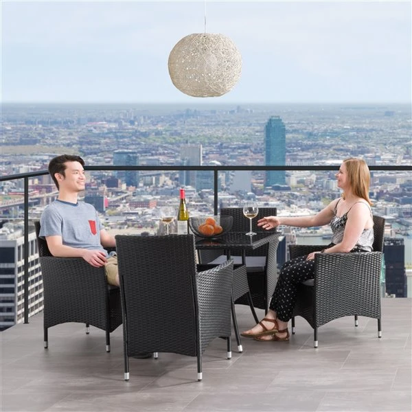 Cet ensemble de 5 pièces est parfait pour toutes les occasions. Robuste et durable, son cadre en acier résiste à la rouille et son osier en résine anti-UV, résistant à tous les temps, conserve un aspect brillant année après année. Le plateau en verre trempé est aussi élégant que fonctionnel. Cet ensemble comprend 4 chaises de patio en osier tressé qui offrent un confort traditionnel avec des lignes modernes. De hauts accoudoirs et des coussins moelleux rendent les repas et les divertissements plus agréables. L’ensemble comprend 4 chaises et 1 table carrée.Fabriqué en acier galvanisé avec un revêtement poudré pour une meilleure durabilitéFabriqué en résine d’aspect osier résistant aux fissures et à la décolorationPlateau en verre trempéPieds en métal pour un soutien optimalCoussins amovibles pour un rangement facile