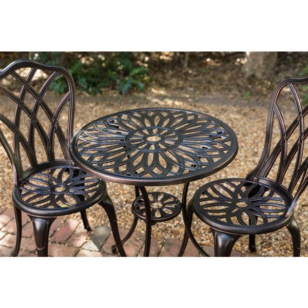 L’ensemble bistro Paradise en aluminium moulé offre à la fois la fonctionnalité et la durabilité dont vous avez besoin pour un petit patio. Il convient aussi parfaitement à un endroit retiré du jardin ou de la cour arrière. C’est un ensemble très léger qui vous permet de le déplacer facilement partout où vous le désirez. Les ornements détaillés et sophistiqués de la table et des chaises seront un sujet de conversation pour vos invités. La structure en aluminium et le fini bronze antique offrent un mobilier d’extérieur qui ne nécessite pas d’entretien. Les instructions faciles à suivre permettent un assemblage rapide.Magnifique ensemble bistro en aluminium coulé au fini bronze antiqueMobilier extérieur de coin repas sans entretienAluminium mouléAssemblage facile, quincaillerie incluse.Sa légèreté facilite le déplacement, sa robustesse permet un usage à long terme.Assemblage requisL’ensemble comprend 2 chaises, une table