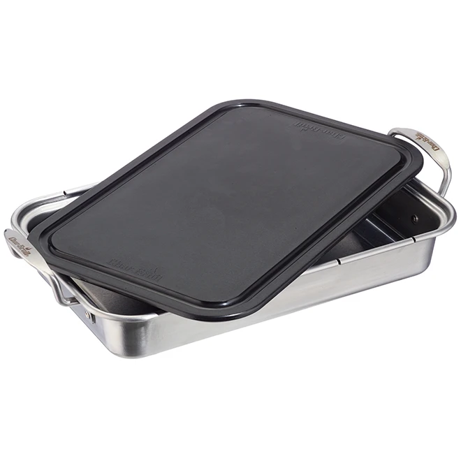 Le plat profond et la planche à découper Grill+ de Char-Broil sont des accessoires de cuisine de qualité supérieure, incontournables pour une vaste gamme de grillades. Le plat profond en acier inoxydable est suffisamment robuste pour résister à la chaleur de votre gril, mais également parfaitement adapté à votre four, ce qui en fait l’accessoire idéal pour rôtir, cuire ou griller une multitude de viandes. La planche à découper en plastique avec rainure à jus sert également de couvercle pour la préparation, l’entreposage et le transport. Vous pouvez ainsi faire mariner les viandes et les conserver au réfrigérateur. Plaque en acier inoxydable de 9 x 14 pouces suffisamment robuste pour résister à une chaleur extrêmeComposant central du système d’accessoires Grill+La planche à découper en plastique à rainure pour le jus sert de couvercle pour la préparation, le stockage et le transportFaites rôtir, cuire ou griller des viandes parfaites, des ragoûts, des desserts et bien plus encoreSolution de transport complète pour une cuisson en une étape – Préparez les aliments crus sur la planche à découper, transportez-les jusqu’au gril, puis ramenez les aliments cuits à table sur la surface intérieure propre du plat à rôtirMariner les aliments dans le plat à rôtir, ajouter le couvercle de la planche à découper et conserver au réfrigérateur jusqu’au moment de la cuissonEntièrement compatible avec le lave-vaisselle