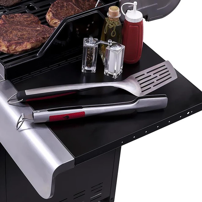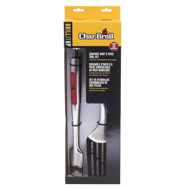 Cet ensemble d’outils pour barbecue Char-Broil(MD) comprend une spatule et une pince, 2 des plus importants accessoires pour tous les amateurs de grillades. Les outils de barbecue sont dotés de poignées confortables qui les rendent faciles à manipuler pendant des sessions de grillades plus longues, et les poignées comportent chacune un crochet de suspension. Les accessoires sont fabriqués en acier inoxydable durable, facile à nettoyer et pouvant résister à une utilisation régulière saison après saison. Nos outils de barbecue sont faciles à nettoyerLes ustensiles de grillade sont dotés de poignées résistantes, durables, non fondantes munies d’une prise confortableLa conception élégante en acier inoxydable en fait un ensemble d’outils de barbecue parfait pour les professionnels