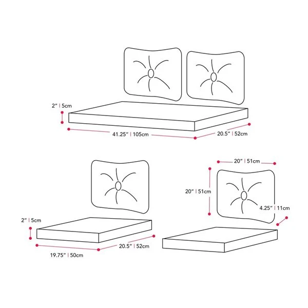 Ajoutez de la personnalité et une touche de couleur à votre espace extérieur grâce à cet ensemble de coussins. Les confortables coussins de siège sont fabriqués à partir d’une mousse de 2 pouces enveloppée d’une nappe ouatée de 1 pouce, avec un épais coussin de dossier. Tous les coussins sont pourvus d’un revêtement extérieur en polyester résistant aux UV, avec passepoil.L’ensemble comprend 3 coussins de siège et 4 coussins de dossierCoussins en polyester durable résistant aux UVCoussins touffetés avec un bouton recouvert de tissuCoussins rembourrés pour plus de confortFinition de passepoil sur les bords