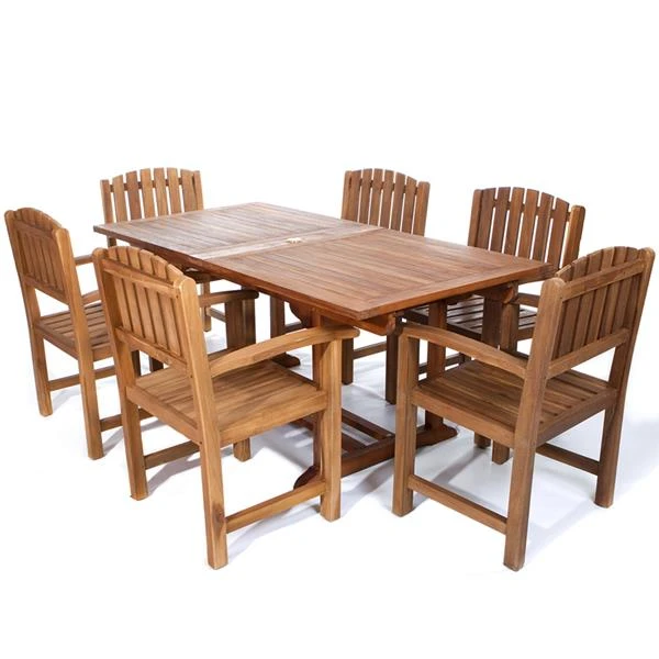 Élégant et solide, notre meuble en teck est créé à la main à partir de véritable teck indonésien et se termine par une huile de teck légère. La menuiserie Tennon et mortaise assure des pièces robustes et bien ajustées. Les tables ont un trou pour parapluie de 1-7 / 8 pouces; Passe-fils et capuchon en laiton inclus.Construction en teckEnsemble inclus: 1x table, 6x chaisesTable: 72l x 36p x 30h (expanpable to 83″ & 95″)Chaise: 24l x 23p x 41HDimensions de la chaise: 24L x 23P x 41H
