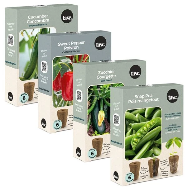 Ensemble de légumes croustillants Tasc de concombres, poivrons, courgettes et pois mangetout, 6 pastilles de chaqueConcombre Burpless SupremeZucchini vert foncéPoivron California WonderPois mangetout