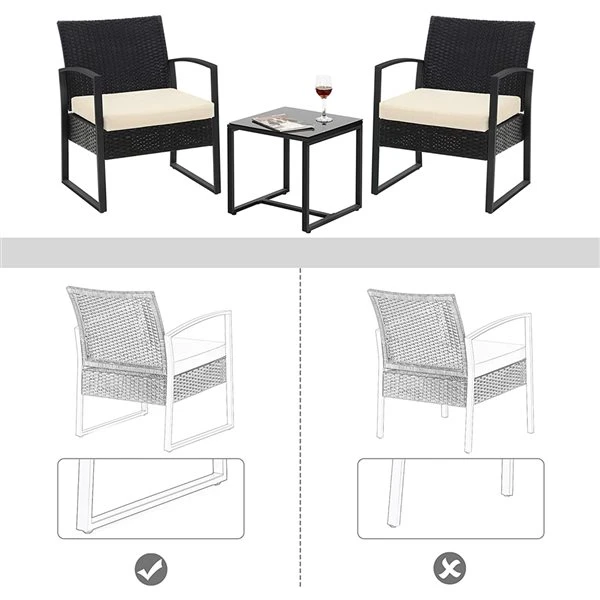 Ajoutez du style à votre patio avec l’ensemble de mobilier extérieur Bistro de SONGMICS. Cet ensemble a été conçu pour se reposer et profiter de la vie, avec de la mousse de 2,8 pouces d’épaisseur et un dossier ergonomique qui s’adapte parfaitement au corps. Grâce aux pieds en acier thermolaqué et au rotin en PE résistant aux intempéries, chaque chaise peut supporter jusqu’à 286 livres. Le dessus de table en verre trempé et le renforcement de la table basse peuvent supporter jusqu’à 66 livres. Les pieds de la table et des chaises sont également équipés de coussinets antidérapants pour protéger le sol et maximiser la stabilité. Finalement, l’ensemble est facile à installer, venant avec des pièces étiquetées.Matériaux : Rotin en polyéthylène (PE) résistant aux intempéries, pieds en acier thermolaqué et dessus de table en verre trempéMatériau du coussin : Rembourrage de fibre de polyester vertical avec housse de tissu en polyesterPoids total du produit : 36,4 lbCapacité de charge maximale de chacune des chaises : 286 lbCapacité de charge maximale de la table : 66 lbCoussinets antidérapants pour protéger le sol et maximiser la stabilitéFacile à assembler