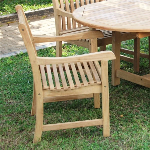 Ajoutez une touche de raffinement traditionnel à votre espace de vie extérieur avec l’ensemble de salle à manger extérieur en teck 7 pièces Cambridge. La table a une extension qui offre la polyvalence nécessaire pour les rassemblements de toute taille. Les chaises sont spacieuses et confortables afin d’accommoder les plus longs repas. L’ensemble est conçu selon les normes les plus élevées du marché et est fabriqué en bois de teck FSC, ce qui le rend robuste et confortable! Il est également poli avec un processus de ponçage pour lui donner une finition lisse. Malgré sa résistance aux changements climatiques, le teck doit être traité puisqu’il prendra graduellement une couleur gris-argenté et présentera quelques fissures. Il est important de laver la surface et d’appliquer une huile pour le bois de haute qualité chaque année, idéalement 2 fois par an.Bois de teck FSC, reconnu pour sa durabilité et sa stabilitéTable avec extensionLa table comprend un trou pour parasolAssemblage requis (outils inclus)Peut rester dehors toute l’année dans n’importe quel climatFacile à nettoyer