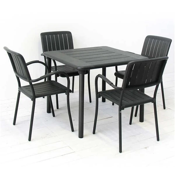 Les chaises empilables Nardi de qualité commerciale ont des pattes faites en résine et un cadre en aluminium anodisé avec pieds antidérapants. Les accoudoirs de résine, le dos, et le siège ont un look de grain de bois. Le Nardi Maestrale est une table carrée de 35 po de qualité commerciale fait pour utilisation extérieure et intérieure. Ce plateau est composé à 100% de résines à base de composites et d’acier galvanisé pour vous offrir des années de durabilité. Les 4 pieds sont en aluminium anodisé durable et les niveleurs de pieds réglables antidérapants sauront assurer la stabilité. Aucun outil requis pour l’assemblage.Résine de couleur charbon avec des pieds en aluminium anodiséFait à partir de tubes en acier galvanisé dans un tube de résineSupporte un poids de 300 lbsLa chaise pèse 9,3 lbs et la table pèse 29,8 lbs
