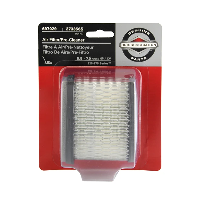 Ce filtre à air et pré-nettoyeur Briggs & Stratton assureront le bon fonctionnement de votre petit moteur. Le filtre en papier absorbe les particules de saleté afin de protéger votre moteur. Il convient parfaitement aux moteurs de tondeuse à gazon monocylindres 4 temps Intek d’une puissance brute de 5,5 à 7 CV. Il est recommandé de remplacer le filtre tous les trois mois ou après 25 heures d’utilisation. Comprend le pré-nettoyeur Briggs & Stratton d’origine # 273356SRemplace l’équipement d’origine Briggs & Stratton # 697029Convient aux moteurs de la série 825-875, de 5,5 à 7,0 CV brutCartouche de filtre à air et pré-nettoyeur Briggs & StrattonConvient aux moteurs de tondeuses Briggs & Stratton Intek OHV