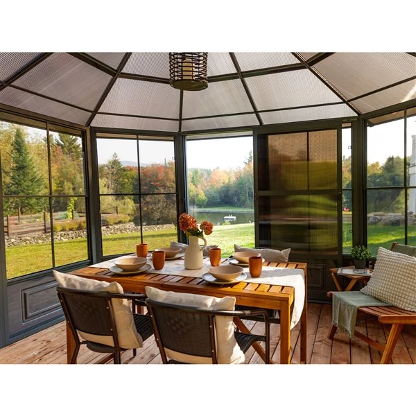 Prolongez le plaisir de votre espace extérieur avec ce solarium. Cette unité peut être laissée en place toute l’année, vous évitant ainsi les problèmes de montage et de démontage à la fin de la saison. Le solarium est construit en aluminium extrudé et dispose d’un toit en polycarbonate renforcé, de deux portes coulissantes que vous pouvez mettre dans la position de votre choix et configurer pour s’ouvrir à droite ou à gauche, et de panneaux à 5 positions. Ce solarium a été soigneusement conçu pour résister à l’exposition à la pluie, à la neige et aux rayons UV. L’unité n’est pas isolée, mais vous pouvez toujours profiter de l’espace supplémentaire pour une journée détente ou pour accueillir vos amis et votre famille lors de diverses festivités sociales.Résiste à la plupart des conditions météorologiquesStructure en aluminium thermolaquéToit en polycarbonate renforcé avec une protection UVLes poignées de porte peuvent être installées où que vous désirez et vous permet de décider si la porte s’ouvre à droite où à gaucheLes panneaux sont réglables avec 5 positions pour permettre une circulation d’air maximaleTous les trous pour les vis comprennent des bouchonsLes deux extrémités des rails de portes sont fermées pour empêcher les insectes d »y entrer et de se reproduireSi le moustiquaire déchire, il est facilement amovible et remplaçableComprend deux portes coulissantes que vous pouvez mettre dans la position de votre choix. Portes en polycarbonate teinté.