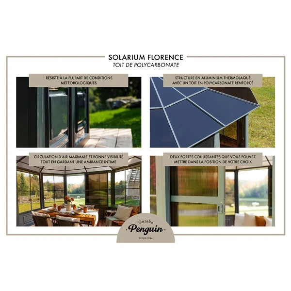 Prolongez le plaisir de votre espace extérieur avec ce solarium. Cette unité peut être laissée en place toute l’année, vous évitant ainsi les problèmes de montage et de démontage à la fin de la saison. Le solarium est construit en aluminium extrudé et dispose d’un toit en polycarbonate renforcé, de deux portes coulissantes que vous pouvez mettre dans la position de votre choix et configurer pour s’ouvrir à droite ou à gauche, et de panneaux à 5 positions. Ce solarium a été soigneusement conçu pour résister à l’exposition à la pluie, à la neige et aux rayons UV. L’unité n’est pas isolée, mais vous pouvez toujours profiter de l’espace supplémentaire pour une journée détente ou pour accueillir vos amis et votre famille lors de diverses festivités sociales.Résiste à la plupart des conditions météorologiquesStructure en aluminium thermolaquéToit en polycarbonate renforcé avec une protection UVLes poignées de porte peuvent être installées où que vous désirez et vous permet de décider si la porte s’ouvre à droite où à gaucheLes panneaux sont réglables avec 5 positions pour permettre une circulation d’air maximaleTous les trous pour les vis comprennent des bouchonsLes deux extrémités des rails de portes sont fermées pour empêcher les insectes d »y entrer et de se reproduireSi le moustiquaire déchire, il est facilement amovible et remplaçableComprend deux portes coulissantes que vous pouvez mettre dans la position de votre choix. Portes en polycarbonate teinté.
