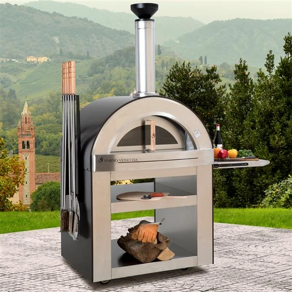 Le four à pizza au feu de bois Torino 500, de conception italienne a une surface de cuisson généreuse de 32 po x 24 po capable de gérer jusqu’à 4 pizzas ou plusieurs plats à la fois. Le foyer en brique réfractaire est recouvert d’une isolation en céramique à double couche pour une excellente rétention de la chaleur et des performances de cuisson supérieures. Un thermomètre intégré à la face du four vous permet de suivre la température interneSurface de cuisson de 24 x 32 poTablette de préparation glissantePorte à four en verre avec poignée en chênePorte-outil à four réglableFoyer en brique réfractaire de qualité commercialeConception d’ouverture traditionnelle pour une ventilation de qualité – conserve la chaleur à l’intérieur du four.