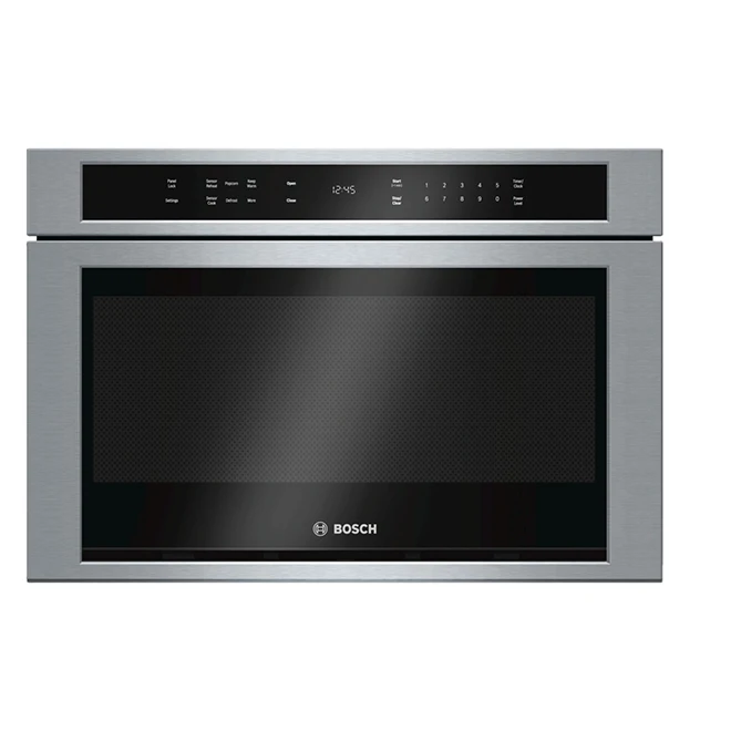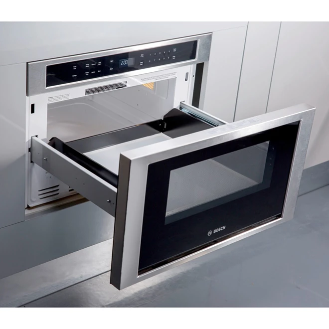 Le four à micro-ondes Bosch Série 800 à profil bas et tiroir s’ouvre et se ferme en appuyant simplement sur un bouton et peut être installé de façon affleurante à vos armoires de cuisine ou adjacent à un four mural Bosch de la même collection. Le four est doté d’un espace suffisamment grand pour accueillir une casserole de 3,79 l, alors que les commandes tactiles en verre avec affichage ACL blanc vous donne un accès direct à une panoplie de fonctions pratiques. Des programmes à capteurs automatiques pratiques simplifient la cuisson pour d’excellents résultats à chaque utilisation. Garantie limitée d’un (1) an. Le tiroir à micro-ondes Bosch de 1,2 pi³ peut contenir aussi bien une tasse de café de 20 oz qu’un moule à pâtisserie de 13 po x 9 po950 watts et 11 niveaux de puissance vous offrent de nombreuses possibilités de cuissonS’ouvre et se ferme facilement en appuyant sur un boutonLe design en acier inoxydable affleurant le meuble est doté d’un écran ACL tactile blanc facile à utiliserLe mode maintien au chaud permet de conserver les aliments au chaud pendant 30 minutesDes programmes automatiques pratiques, tels que le maïs soufflé et le réchauffage, simplifient la cuisson pour un résultat optimalLe micro-ondes à tiroir intégré de 24 pouces peut être installé sous le comptoir ou sous un four muralLe verrouillage du panneau empêche toute utilisation indésirable du tiroir, ce qui empêche les jeunes enfants de l’utiliserCordon d’alimentation de 48 pouces à 3 broches inclus pour votre confort