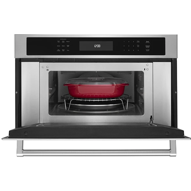 Que ce soit pour préparer de délicieux rôtis ou réchauffer des plats surgelés, vous serez comblé par ce four à micro-ondes KitchenAid(MD) et sa capacité de 1,4 pi³. Le système de cuisson à convection utilise un élément de 1600 W qui permet de faire cuire vos mets favoris à une température allant jusqu’à 425 °F. La fonction EasyConvect(MC) vous permet d’économiser un temps précieux et d’éliminer les incertitudes lors de la cuisine. D’autres fonctions intéressantes vous sont offertes, y compris des options préprogrammées, un système de verrouillage des commandes et un mode de cuisson à la vapeur avec capteur, analysant le type d’aliment et le niveau de cuisson désiré. Il possède une plaque de cuisson et la technologie Crispwave(MC), vous offrant la possibilité de faire frire ou griller vos mets. Garantie limitée d’un (1) an sur pièces et main-d’oeuvre, de 5 ans sur les pièces de certains composants, et de 10 ans sur le four uniquement. Le four à micro-ondes à convection intégré KitchenAid de 1,4 pi³ fait circuler la chaleur dans la cavité du four grâce à un élément de convection de 1600 watts qui permet de cuire à des températures maximale de 450 °FLe cycle de cuisson à la vapeur par capteur permet une cuisson précise en fonction du type d’aliment et du niveau de cuisson sélectionné, et il comprend un récipient à vapeur pour vous aider à obtenir les meilleurs résultats pour les légumes frais, les crevettes et autresLe système de conversion EasyConvect(MC) élimine les incertitudes liées à la cuisson par convection en garantissant des résultats exceptionnels, qu’il s’agisse de nouvelles recettes ou de plats favorisLa finition en acier inoxydable et l’intérieur antiadhésif, les poignées à texture satinée et le cadre incrusté de chrome offrent une belle apparence qui est facile à nettoyer et à utiliser3 options de cuisson par capteur ajustent automatiquement le temps de cuisson et le niveau de puissance pour votre confortLa technologie Crispwave(MC) fonctionne avec un bac à légumes, ce qui vous permet de faire griller, frire et cuire par convection du bacon ou des frites directement au micro-ondesL’élément de grillage combine la puissance élevée et la couverture uniforme nécessaires pour obtenir des résultats similaires à ceux des grillades en plein airUne grille permet de cuire plus d’aliments à la fois