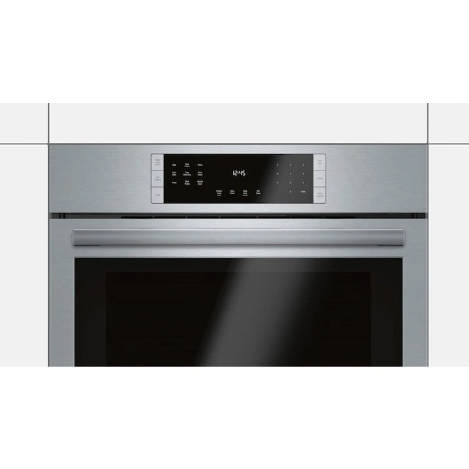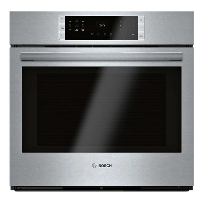 Cet esthétique four mural de la série 800 de Bosch présente un élégant fini acier inoxydable et comprend de nombreuses fonctions susceptibles de faciliter la préparation de vos repas quotidiens. Le système de cuisson à convection européenne véritable permet d’obtenir des rôtis tendres et juteux jusqu’à 25% plus rapidement comparativement aux fours traditionnels. La fonction à préchauffage rapide optimise votre emploi du temps, tandis que la sonde thermique permet de surveiller la température interne sans que vous ayez à ouvrir la porte. Une fois le repas préparé, un cycle d’autonettoyage (cycles de 2, 3 et 4 heures disponibles) se charge de récurer les grilles et parois. Téléchargez l’application Home Connect pour surveiller et contrôler à distance votre four mural à partir de votre téléphone intelligent ou tablette. Gardez les aliments au chaud sans les brûler jusqu’au moment de les servir en utilisant le mode de maintien de la chaleur. Le mode multi-grilles à convection donne des résultats de cuisson uniformes, et ce, même lorsque les 3 grilles sont utilisées simultanément. Enfin, le grillage à porte fermée procure aux mets un extérieur croustillant tout en empêchant la chaleur intense de s’échapper du four. Préchauffez le four en moins de temps grâce au préchauffage rapide, pour que les repas soient prêts plus rapidementQue vous cuisiniez de la volaille, du boeuf ou du porc, utilisez la sonde de température de la viande pour surveiller la température interne et obtenir des résultats parfaits à chaque foisNe ratez jamais une occasion de servir le dîner à temps grâce à des outils tels qu’une minuterie de four, une fonction de cuisson différée et une minuterie de cuisine numériqueDétendez-vous ou consacrez-vous à d’autres tâches pendant que le four inférieur se nettoie tout seul grâce au cycle d’autonettoyage. Cycles de 2, 3 et 4 heures offertsTéléchargez l’application Home Connect pour surveiller et régler à distance votre four mural Bosch avec votre téléphone intelligent ou votre tabletteGagnez du temps dans la cuisson de vos plats de viande préférés en utilisant les modes rôtissage ou rôtissage par convection qui ne demande pas de préchauffageRésultats de cuisson uniformes même lorsque les trois paniers sont utilisés simultanémentLe gril à porte fermée empêche la chaleur intense de s’échapper du four, ce qui permet de dorer uniformément les morceaux de viande tendres et de griller parfaitement les plats en cocotteCompte deux grilles standard et une grille à coulisse qui facilite l’accès aux plats lourds ou volumineux