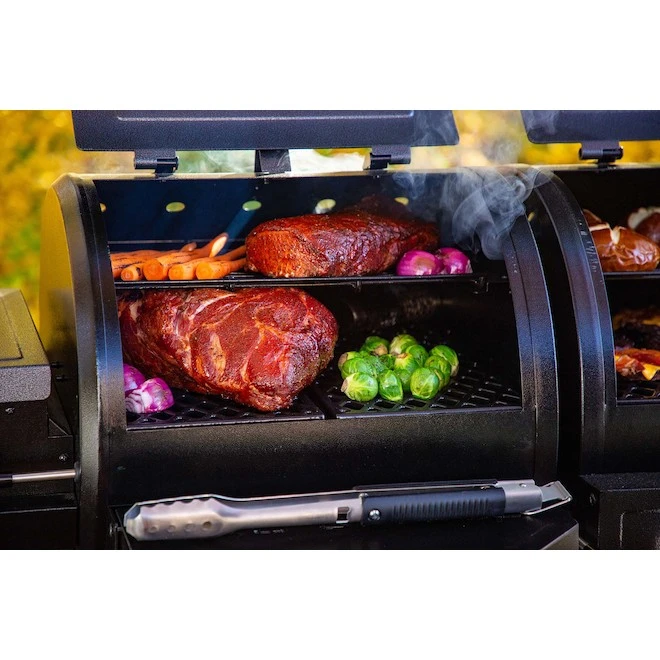 Grâce à Pit Boss, vous avez ce qui est nécessaire pour cuisiner comme un pro. Le gril Pro Series II 1100 vous offre la possibilité de choisir entre une cuisson au gaz ou aux granules. Cela signifie que vous pouvez obtenir des résultats de cuisson rapidement ou donner à votre viande grillée une saveur boisée unique. Le gril au gaz possède 3 brûleurs principaux totalisant 30 000 BTU et un brûleur latéral qui procure 10 000 BTU. Les grilles vous procurent une surface de cuisson de 1230 pouces carrés au total, un espace amplement suffisant pour cuire un repas en entier, incluant les accompagnements. Cet appareil avec connexion Wi-Fi et Bluetooth est lié à votre téléphone intelligent, vous pouvez donc observer les réglages de votre gril en tout temps et recevoir des notifications dès que votre nourriture atteint la température de cuisson adéquate. Grâce aux fonctionnalités WiFi et Bluetooth, vous avez toute latitude pour connecter votre Pro Series à un appareil intelligent pour une expérience de cuisson plus contrôléeLa trémie de 20lb vous donne assez de combustible pour cuire même les plats les plus bas et les plus lentsAvec 1262 pouces carrés de grilles de cuisson réglables en fonte revêtue de porcelaine Crosshatch, vous n’aurez pas à vous inquiéter de manquer d’espace de cuisson. 631 pouces carrés pour la cuisson au pellet et 631 pouces carrés pour la cuisson au gazDeux ports de sonde à viande vous permettent de contrôler et d’affiner la température optimale. Une sonde à viande est incluse avec l’achat de votre grilCet appareil offre une grande polyvalence grâce à ses 4 brûleurs à gaz en acier inoxydable, ses capacités de cuisson à granulés et de fumage à froid, ainsi qu’un brûleur latéral supplémentaire pour encore plus d’espaceLa carte de contrôle numérique PID est entièrement programmable, vous permettant d’atteindre des températures de 180-500°FFaites monter la température avec le levier du gril à flamme qui permet de saisir à la flamme directe jusqu’à 1 000°FNotre système de gestion des graisses est doté d’un simple seau d’égouttage en acier. Il suffit de remplacer la feuille d’aluminium pour le nettoyage. Feuilles d’aluminium non incluses