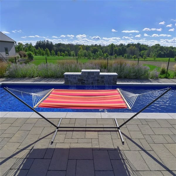 Le hamac double largeur est fait de coton doux et respirantConçu avec une barre scellée en bois et des cordes en polyester solides et durablesFacile à assemblerSupport robuste en acier thermolaqué