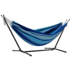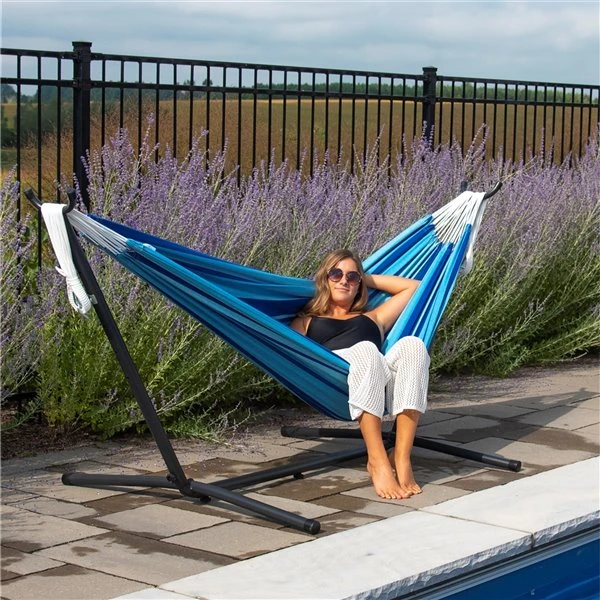 Hamac bleu de format double comprenant un support et un sac de transport.Conçu pour deux, partagez le hamac double en coton avec un ami. Le tissu respirant rend la relaxation sans effortLes cordes d’extrémité en polyester dureront plus longtemps que les cordes d’extrémité en coton traditionnellesAssemblez votre hamac et son support en quelques minutes, sans aucun outilLes crochets de hamac facilement réglables vous permettent de décider à quelle hauteur vous voulez poser. Pour un confort maximal, posez-le en diagonale