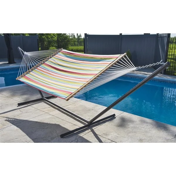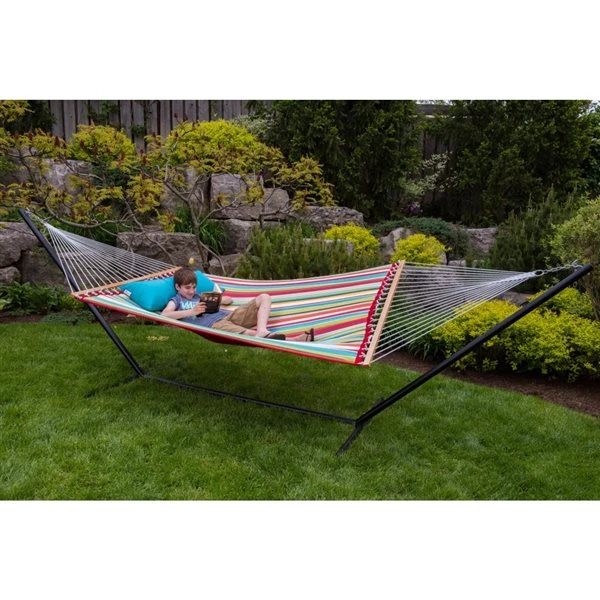 Ces hamacs réversibles ont un design intéressant grâce aux couleurs agencées d’un côté et de l’autre. Une fibre de Poly-fil prise entre deux couches de polyester lui ajoute un confort supplémentaire. Des œillets sont utilisés le long du hamac pour attacher les extrémités de la corde en polyester. Ce hamac résiste à la décoloration jusqu’à 500 heures d’exposition directe au soleil. Ce hamac, du modèle « Ciao », est idéal pour une longue vie en plein air et est une belle façon d’embellir votre jardin.Le tissu matelassé rend ce hamac exceptionnellement confortable; il n’est pas recommandé pour ceux qui souhaitent rester éveillésCe hamac réversible vous permet de choisir entre un côté magnifique et un côté fantastique, rien de moinsLe soleil ne peut abîmer ce hamac, car celui-ci est conçu pour 500 heures d’utilisation à l’extérieur avant de se décolorerLa barre d’écartement en bois de 54 po ouvre davantage le hamac afin de permettre assez d’espace pour deux personnes