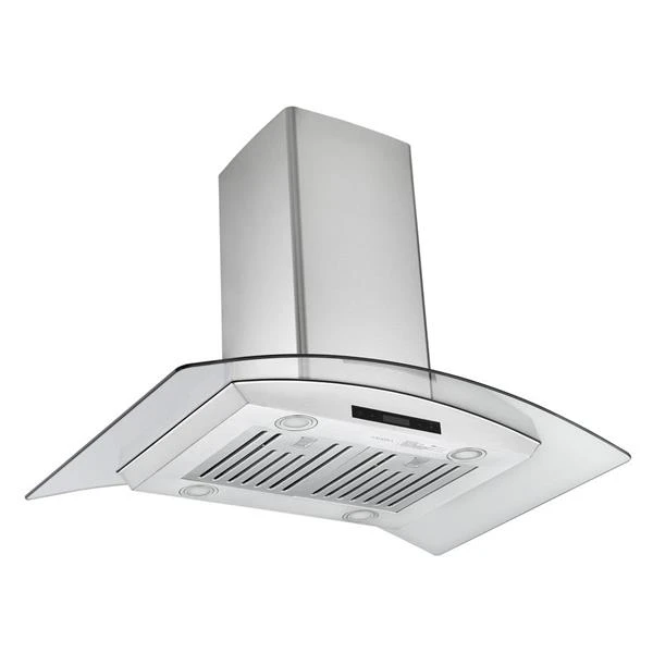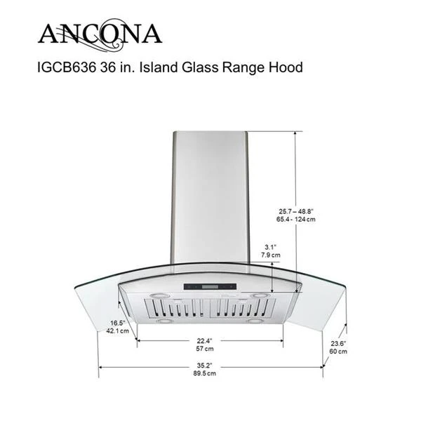Créer un coup d’éclat dans votre cuisine avec la hotte « Island Glass » de 36 pouces Ancona. Cette superbe hotte de cuisinière comprend un panneau de commande tactile moderne à écran LCD avec extinction automatique, des lumières LED écologiques de longue durée et des filtres à déflecteur en acier inoxydable faciles à nettoyer. Le puissant moteur de 620 PCM testé indépendamment, associé à notre technologie exclusive Ultra Silencieuse, éliminera la fumée, l’humidité et les arômes de cuisson tout en vous permettant de profiter de vos conversations au dîner. Faites de votre îlot de cuisine le lieu de rassemblement de votre maison avec Ancona!Hotte de cuisine de 36 pouces pour îlot convertible en acier inoxydableTechnologie Ultra Quiet d’Ancona (première vitesse à moins de 40 dBA).620 pi3/min – Testée de façon indépendante, homologuée cETLus.Panneau de commandes tactiles à trois vitesses avec dispositif d’arrêt automatique différé.Quatre ampoules DEL de 2,55 W à réglages multiples conçues par Ancona : puissantes, brillantes et écoénergétiques; affichent une durée de vie jusqu’à 10 fois plus longue que les ampoules traditionnelles.Filtres à chicane – lavables au lave-vaisselle, faciles à nettoyer.Évacuation vers le haut (circulaire, 15,24 cm [6 po]). Convertible en unité de recirculation intérieure à l’achat d’une trousse de filtres de conversion (vendue séparément).120V / 60Hz / 3.16ALogo discrètement caché peut s’intégrer à tous les appareils de cuisine