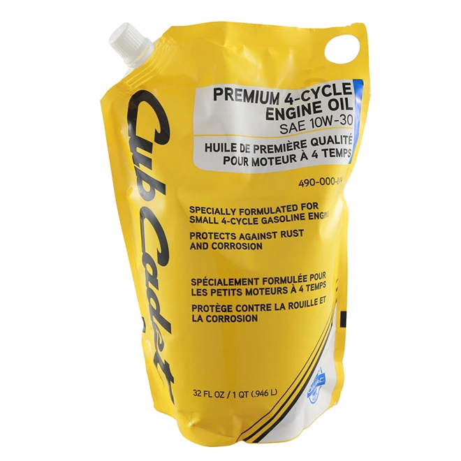 Cette huile de tondeuse 10W-30 Cub Cadet(MD) prédosée à 946 ml est spécialement formulée pour les moteurs à essence à 4 temps refroidis à l’air, y compris les tondeuses à gazon, les tracteurs de jardins et de pelouse, les motoculteurs, les génératrices et autres équipements motorisés extérieurs. Elle protège contre la rouille et la corrosion. Cette huile satisfait ou dépasse les classifications API SJ. Bouteille d’huile pour tondeuse à gazon Cub Cadet 10W30 pré-dosée de 946 mlSpécialement formulé pour les moteurs à essence à 4 temps refroidis par air, notamment les tondeuses à gazon, les tracteurs de pelouse et de jardin, les motoculteurs, les générateurs et autres équipements motorisés d’extérieurLa pochette contient 946 ml (32 fl oz)Elle protège contre la rouille et la corrosion.Cette huile satisfait ou dépasse les classifications API SJ.
