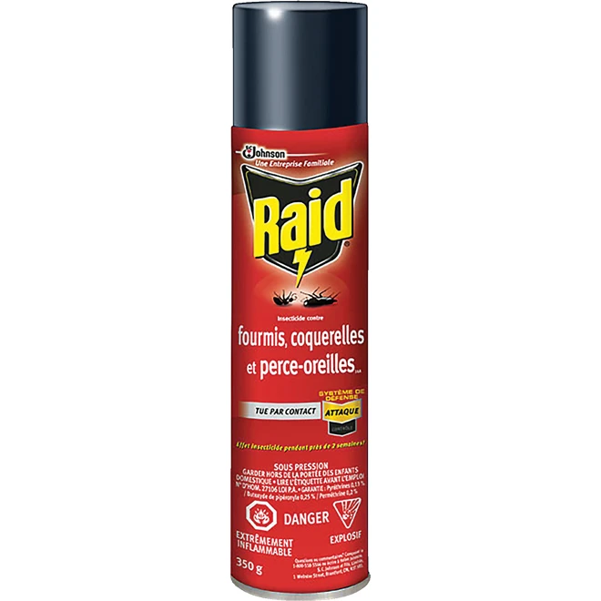 L’insecticide en aérosol Raid élimine les fourmis, les coquerelles, les perce-oreilles, les puces, les araignées, les mille-pattes, les punaises de lit, les lépismes argentés et les grillons. Cette formule en aérosol facile à utiliser s’attaque à n’importe quelle surface infestée et ne laisse aucune odeur chimique persistante et désagréable. Il tue au contact et continue de tuer avec son action résiduelle. Vaporisez toutes les 4 semaines au besoin pour assurer une bonne lutte antiparasitaire sur les surfaces intérieures. Pour une utilisation intérieure et le traitement du périmètre extérieurTue par contact et offre une action résiduelle jusqu’à 2 semaines