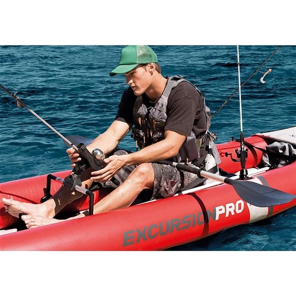 Kayak gonflable Excursion pour 2 personnes en polymère rouge par Intex de 12,5 pi x 18 poSérie ProfessionnelleMatériau stratifié très résistant avec noyau en polyester pour une grande solidité et durabilité, une grande résistance aux chocs et à l’abrasion, tout en conservant un poids légerLe gonflage à haute pression offre une rigidité et une stabilité accrues, avec des valves à ressort à haute pression pour un gonflage facile et un dégonflage rapideDeux ailerons amovibles spécialement conçus pour une maniabilité optimale en eaux profondes et peu profondesDeux repose-pieds au solDeux porte-cannes à pêche facilement détectablesSupport amovible et réglable pour caméra GoPro et téléphone portable – s’enclenche facilement dans la base de fixation des accessoiresPoignées de maintien aux deux extrémitésEspace de rangement à l’avant et à l’arrière avec des anneaux en D en acier inoxydable pour attacher les sacs imperméables et le matériel