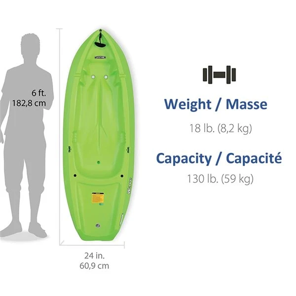 Le kayak Wave™ de 6 pieds de Lifetime est spécifiquement conçu pour les enfants de 5 ans et plus, ou jusqu’à 130 livres. La position large fournit une plateforme de pagayage stable pour garder votre enfant en sécurité dans le kayak. Son extrémité arrière inclinée et sa marche de baignade permettent au conducteur de rentrer facilement dans le kayak depuis l’eau. Avec ses dalots, ses multiples positions pour poser les pieds et sa grande stabilité, le Wave™ est parfait pour les enfants qui veulent pagayer !Support de pagaie mouléLa conception de l’aileron double aide à la performance de suiviRecommandé pour les enfants de 5 ans et plus sous la surveillance d’un adultePagaie de kayak pour jeunes incluseProtégé contre les rayons UVNe se décolore pas, ne se fissure pas et ne fend pasPoignées moulées de chaque côté du kayakPlusieurs positions pour poser les pieds pour les pagayeurs de différentes taillesConstruction durable en polyéthylène haute densité (PEHD)