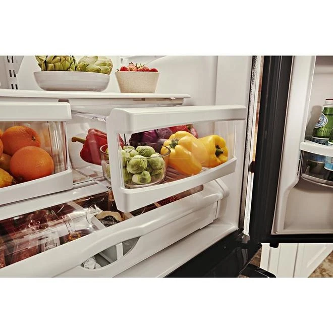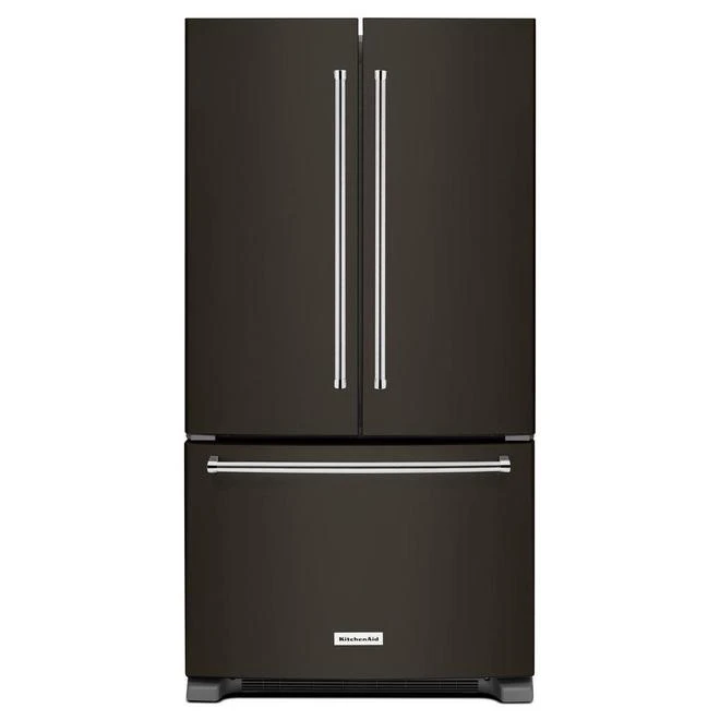 Ce réfrigérateur à portes françaises de marque KitchenAid est aussi magnifique que pratique. De couleur noire, il offre 20 pi³ d’espace et sa conception à profondeur de comptoir lui confère un aspect encastré. Cet appareil est doté du système de gestion de la température ExtendFresh(MC) et possède un conservateur de fruits et légumes qui absorbe le gaz éthylène produit par ceux-ci afin de retarder le mûrissement. Le réfrigérateur possède un éclairage DEL et il est muni du tiroir garde-manger pleine largeur FreshChill(MC) avec réglage manuel de la température. L’appareil est également doté d’un distributeur d’eau et d’une machine à glaçons, et comporte la fonction de refroidissement Max Cool qui ajuste la température lorsque les portes restent ouvertes trop longtemps ou si la température ambiante est élevée. À l’aide de capteurs dans le réfrigérateur et le congélateur, le système ExtendFresh(MC) garde vos aliments à la température idéale pour en optimiser le goût et la textureGrâce au distributeur interne, vous aurez facilement accès à une eau filtréeLe conservateur de fruits et de légumes absorbe l’éthylène que bien des fruits et des légumes produisent, de sorte qu’ils murissent moins viteLe bac à légumes à humidité contrôlée permet de régler l’humidité, vous offrant ainsi une option de stockage spécifique pour conserver les aliments frais à un niveau d’humidité optimalLe garde-manger pleine largeur à température contrôlée FreshChill(MC) vous permet de ranger correctement toutes sortes d’aliments, qui vont de la viande aux fruits et légumes, grâce à un réglage manuel de la quantité d’air froid qui entre dans le tiroirLa fonction Max Cool ajuste automatiquement la température dans le réfrigérateur et le congélateur au réglage le plus bas, le cas échéantL’éclairage à DEL illumine l’intérieur de votre réfrigérateur et de votre congélateur pour que vous puissiez facilement trouver ce dont vous avez besoinDans le porte-bouteilles de vin en métal, il est possible de ranger jusqu’à quatre bouteilles ou contenants de 2 L, et il peut être retiré au besoinLes garnitures métalliques sur le bord des tablettes ajoutent une touche d’élégance et viennent compléter l’intérieur lustré du réfrigérateur