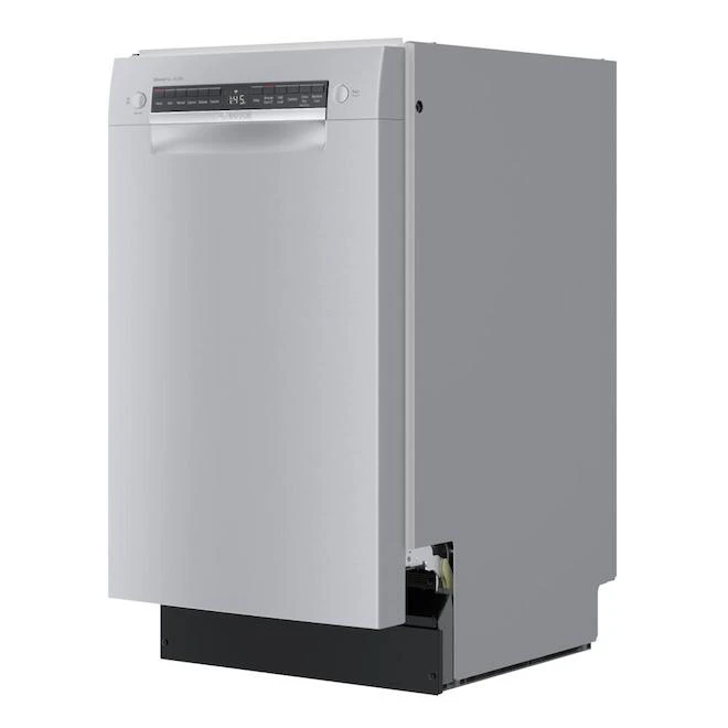 Le lave-vaisselle Bosch de 18 pouces de largeur conforme à la norme ADA est de taille compacte et dispose de technologies sophistiquées pour un fonctionnement silencieux, des performances exceptionnelles et une flexibilité remarquable, le tout dans un design épuré et élégant. L’adoucisseur d’eau garantit une vaisselle parfaitement brillante et sans taches. La machine propose 3 niveaux de hauteur, pour 9 positions de crémaillère possibles. AquaStop(MD) plus offre une protection contre les fuites en 4 parties prévient les dégâts d’eau 24h/24 et 7j/ 7. La minuterie de démarrage différé de 24h vous permet de faire fonctionner votre lave-vaisselle aux heures creuses. Le nouveau 3e panier offre plus de surface de chargement pour un total de 16 couverts. Panneau de commande avant. Conformité aux normes ADA et taille compacte pour les petits espacesUn troisième support de série ajoute de la polyvalence et une plus grande capacité de chargementMise en marche différée 24 h permet de mettre votre lave-vaisselle en marche aux heures moins affluentesMise en marche différée 24 h permet de mettre votre lave-vaisselle en marche aux heures moins affluentesLe nouveau troisième panier offre plus d’espace de chargement pour un total de 16 couverts