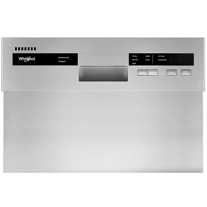 Nettoyez votre vaisselle rapidement grâce à ce lave-vaisselle encastré de marque Whirlpool(MC). Grâce à sa taille compacte, il est parfait pour les petits espaces. Avec sa fonction de mémorisation du dernier programme, le lave-vaisselle vous permet de gagner du temps en choisissant automatiquement le cycle pour vous. De plus, il demeure silencieux pendant toute la durée du cycle grâce à un niveau sonore de seulement 50 dBA. Sélectionnez le programme normal pour une utilisation quotidienne ou le programme intensif lorsque votre vaisselle est très sale. Un programme de nettoyage des verres vous permet également de nettoyer vos verres et de leur conférer un éclat étincelant. L’option de lavage à température élevée vous offre un nettoyage en profondeur et l’option de séchage à la chaleur sèche votre vaisselle plus rapidement. Le lave-vaisselle est couvert par une garantie limitée d’un an sur les pièces et la main-d’oeuvre. Solution pour les petits espaces : 8 couverts peuvent être placés dans ce lave-vaisselle compact qui offre plus de commodité et d’espace pour travailler dans la cuisineMémoire de cycle : pour un nettoyage rapide des dégâts courants, ce lave-vaisselle se souvient du dernier cycle choisi et le mémorise automatiquement pour la prochaine foisCasier supérieur réglable qui se monte ou se descend manuellement de 5 cm pour mieux s’adapter aux articles de grande tailleCe lave-vaisselle répond aux standards de conception accessible spécifiés par la loi sur les personnes ayant des incapacités aux États-Unis afin de procurer un accès égalitaire à tousPerformance de nettoyage silencieuse : gardez votre cuisine silencieuse pendant le nettoyage avec un lave-vaisselle à niveau sonore de seulement 50 dBACuve en acier inoxydable : assurez-vous que les plats sortent secs grâce à la cuve en acier inoxydable qui refroidit rapidement afin que l’humidité ne se condense pas sur les platsL’option de lavage à haute température permet un nettoyage plus en profondeur d’articles comme les biberons et la verrerieBras gicleur double : un espace réduit ne signifie pas que vous devez sacrifier la performance de nettoyage, grâce à un lave-vaisselle doté d’un bras gicleur séparé dans chaque panierVerrouillage des commandes : évitez facilement toute utilisation involontaire en maintenant le bouton de verrouillage enfoncé pendant 3 secondes pour verrouiller les commandes du lave-vaisselle