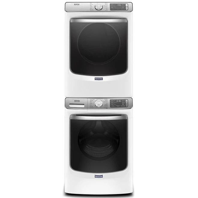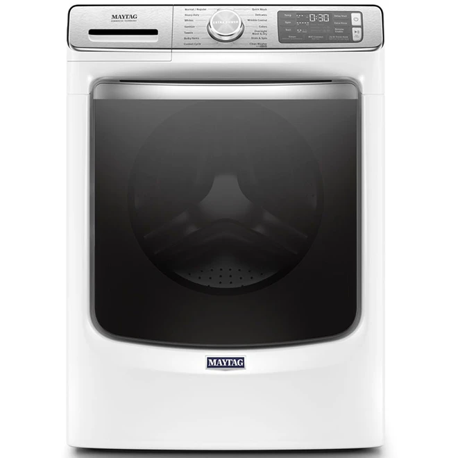 Cette laveuse à chargement frontal Maytag offre aux utilisateurs une efficacité de nettoyage ultime avec la combinaison du cycle Heavy Duty et de la fonction Extra Power. Le bouton Extra Power maximise la performance anti-taches de tous les programmes grâce à la technologie de lavage à double température. Cet appareil offre 14 cycles de lavage pratiques, dont un cycle de lavage rapide qui prend soin des petites brassées en seulement 15 minutes et un cycle de désinfection à haute température qui élimine 99,9 % des bactéries courantes. Tous ces cycles peuvent être suivis de l’option Fresh Hold, spécialement conçue pour conserver l’odeur de fraîcheur des vêtements propres dans la machine à laver pendant 24 heures après la fin du cycle. Pour ce faire, cette option a recours à un ventilateur interne et un culbutage intermittent qui font circuler l’air à travers les vêtements propres. Sa vitesse d’essorage accrue extrait plus d’eau et accélère le processus de séchage. De plus, sa connectivité Wi-Fi vous permet de gérer les paramètres de la machine à laver directement sur votre téléphone intelligent et d’y recevoir des notifications. Nettoyage le plus puissant sur le marché grâce au cycle à grande puissance et au bouton de puissance supplémentaireBouton de puissance supplémentaire : améliore l’élimination des taches sur tous les cycles de lavage avec l’utilisation de températures doublesAppareil intelligent : occupez-vous de votre brassée à partir de votre téléphone ou tabletteOption FanFresh(MD) 24 heures : cette option veille à ce que vos vêtements propres gardent une bonne odeur dans la laveuse à l’aide d’un ventilateur interne et d’un culbutage intermittent qui fait circuler l’air dans vos vêtements pendant 24 heures au maximum après la fin du cycle de lavageDistributeur de doses optimales : le distributeur de doses optimales ajoute la bonne quantité de détergent au moment voulu et peut contenir un total de 12 brassées de lingeCycle de lavage rapide : lave les petites brassées peu souillées en moins de temps en utilisant de hautes vitesses d’essorage qui extraient plus d’eau, pour sécher les vêtements efficacementCycle de désinfection : élimine 99,9 % des bactéries courantes à l’aide d’eau à température très élevée, pour des vêtements propres qui vous procurent une tranquillité d’espritÉlément chauffant interne qui prête main forte au détergent en l’aidant à déloger les taches tenaces grâce à des températures d’eau plus élevéesFonction d’ajout tardif : si vous avez oublié d’ajouter quelque chose à votre brassée, il vous suffit d’appuyer sur le bouton de démarrage pour mettre la laveuse en pause et ajouter les articles de dernière minute