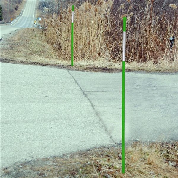 Protégez votre aménagement paysager en indiquant les dangers ou les limites de propriété et accélérez le déneigement grâce à cet ensemble de 48 marqueurs d’allée, adaptés à un usage résidentiel et commercial. Des tiges vertes à haute visibilité de 48 po avec des bandes réfléchissantes de 9 po peuvent être vues depuis tous les angles. Les tiges en fibre de verre durables résistent aux températures extrêmes et rebondissent lorsqu’ils sont poussés plutôt que de se casser ou de se déformer.Marquez les allées, les dangers, les limites de propriété, les chemins privés, les zones de déneigementLa couleur verte haute visibilité se démarque de l’environnementBande de ruban réfléchissant blanc de 9 po (22,9 cm) au niveau des pharesTaille de 48 po (1,23 m) idéale pour une végétation importante ou une forte accumulation de neigeLa fibre de verre durable est très résistante aux intempéries extrêmesTige en fibre de verre flexible de 5/16 po (0,8 cm)Rebondis sous la force plutôt que de se casser comme du bois ou de se plier comme du métalOffre une visibilité de 360 degrés depuis tous les angles, de jour comme de nuitCapuchon de protection en caoutchouc et base conique pour une installation facile dans le sol